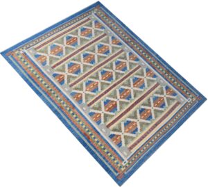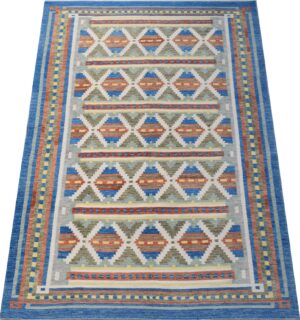 The rug’s design features a dynamic interplay of diamond and stripe patterns. The primary colors include various shades of blue (from deep navy to lighter sky blue), several tones of gray, warm oranges, and creamy off-whites. The diamond patterns are intricately woven, creating a focal point within the design. The stripes, both horizontal and vertical, intersect and complement the diamonds, adding movement and visual interest. The interplay of colors and geometric shapes creates a visually compelling tapestry that adds depth and character to the rug. The flatweave construction and subtle texture are hallmarks of Kilim rugs.