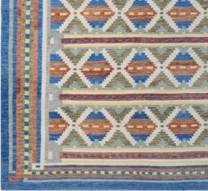 With its sophisticated combination of blues, grays, oranges, and creams, this large modern Kilim rug effortlessly adds a touch of contemporary flair to any room. Whether placed in your living room, dining area, or family room, it becomes an instant focal point, sparking conversation and admiration.