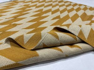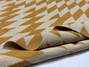 The rug’s design features a repeating diamond trellis pattern. The primary color is a warm, rich gold, forming the intricate diamond shapes. The background color is a soft, creamy off-white, providing a striking contrast to the gold and making the pattern stand out. The clean lines and precise geometry of the design are hallmarks of modern Kilim aesthetics. The interplay of the two colors creates a visually compelling tapestry that adds depth and character to the rug. The flatweave construction and subtle texture are typical of Kilim rugs.