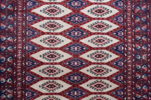 The primary colors of this rug are a rich, deep red serving as the border and accent, a warm, creamy beige forming the base of the central pattern, and stark black outlining the geometric details. This creates a visually compelling contrast that adds depth and character to the rug. The geometric pattern consists of repeating diamond shapes, each filled with smaller, intricate designs, demonstrating the meticulous craftsmanship involved.