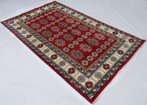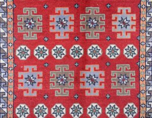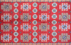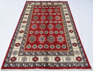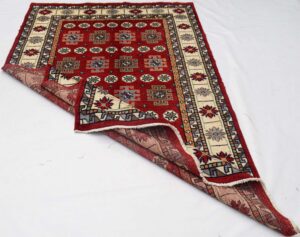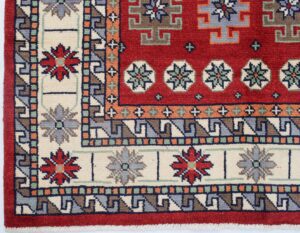 Stunning vintage Sherazi rug (SBR007) with a bold geometric design in vibrant reds, creams, and blues. Hand-knotted with intricate detail. Size: 4.10×8.0 feet (148×243 cm). A unique and timeless piece.